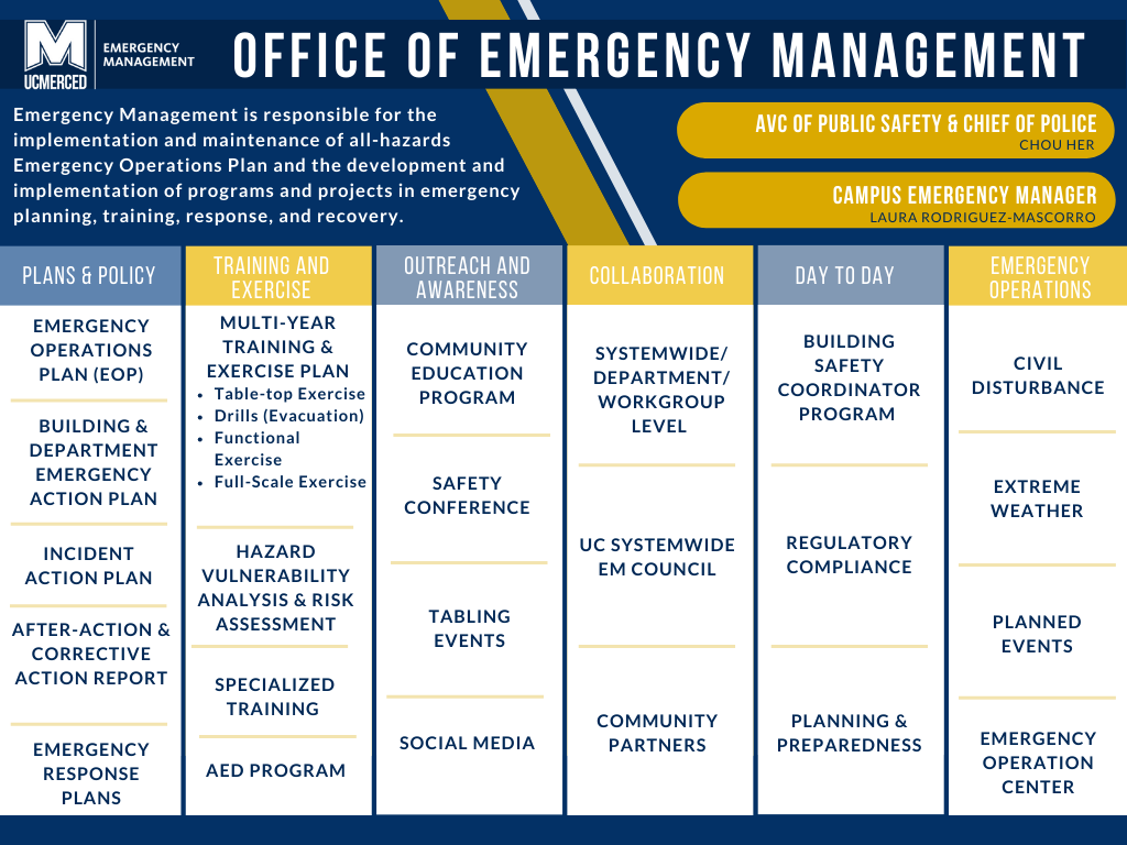 The UC Merced Office of Emergency Management is dedicated to protecting our community through preparedness and coordination. We work collaboratively to plan and prepare the campus for emergencies; provide training, education, and resources that build a culture of preparedness; and lead partnerships that strenghthen the university's ability to withstand, respond to, and recover from all-hazards incidents.